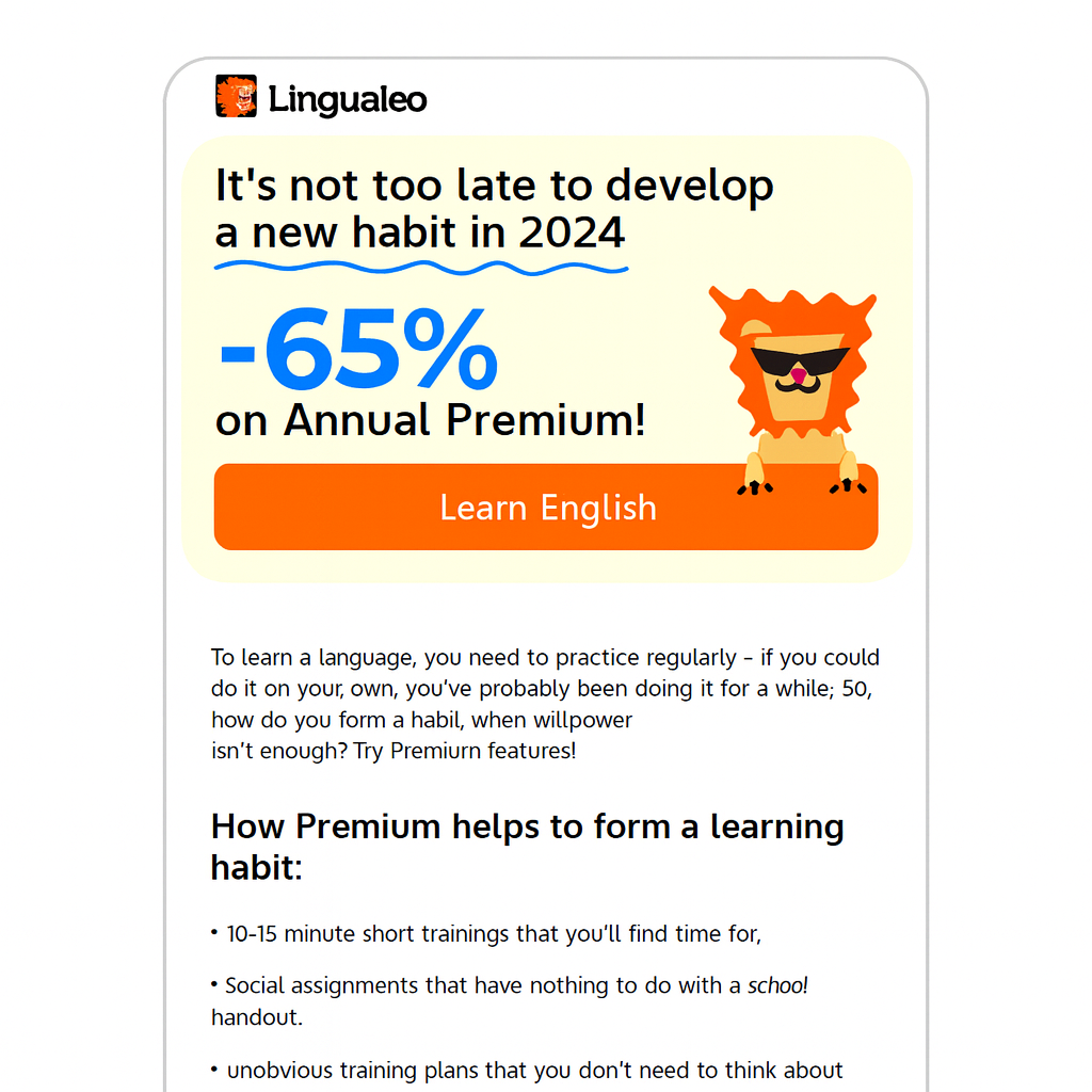 For example, imagine someone subscribes to an English language school newsletter expecting helpful tips on learning, updates about new courses, or even interesting language facts. Instead, they keep getting emails like “65% off all courses!” or “Sign up now and get a free lesson.”