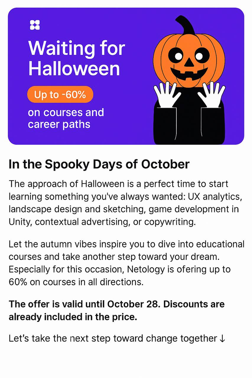If you’re running discounts on multiple services, don’t cram them all into one message. For instance, if you’re promoting discounts across all training programs, make sure to tailor the offer based on which course the user previously took — giving them a personalized deal instead.