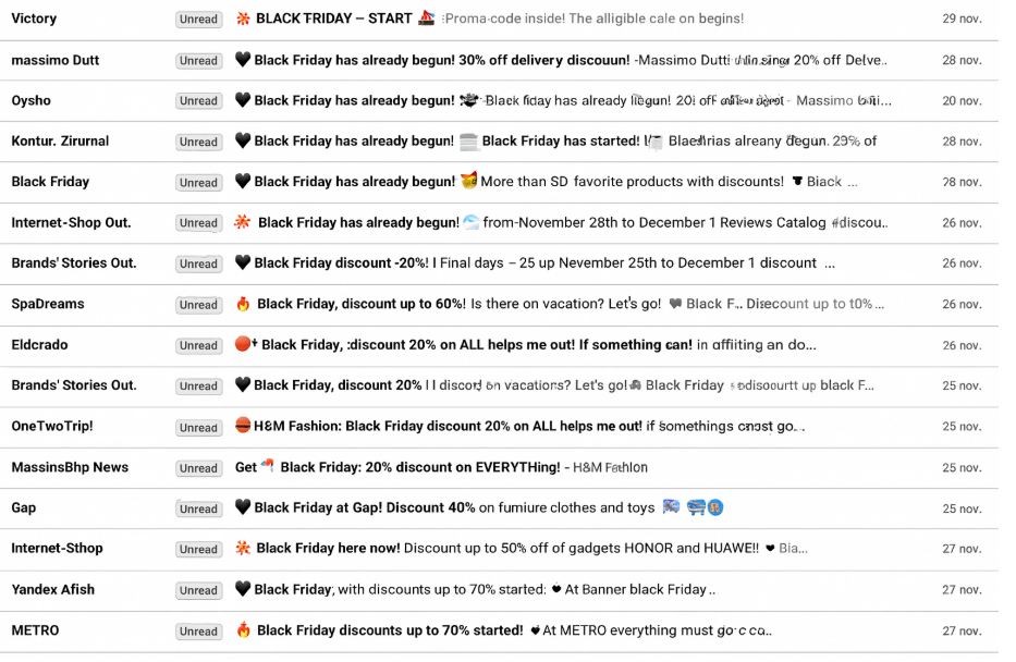 For example, an email with the subject line “SALE!!! DISCOUNTS!!! BUY NOW!!!!” is almost guaranteed to end up in spam or get ignored — it looks like mass advertising and offers no real value. This is especially true during holiday seasons like Black Friday.
