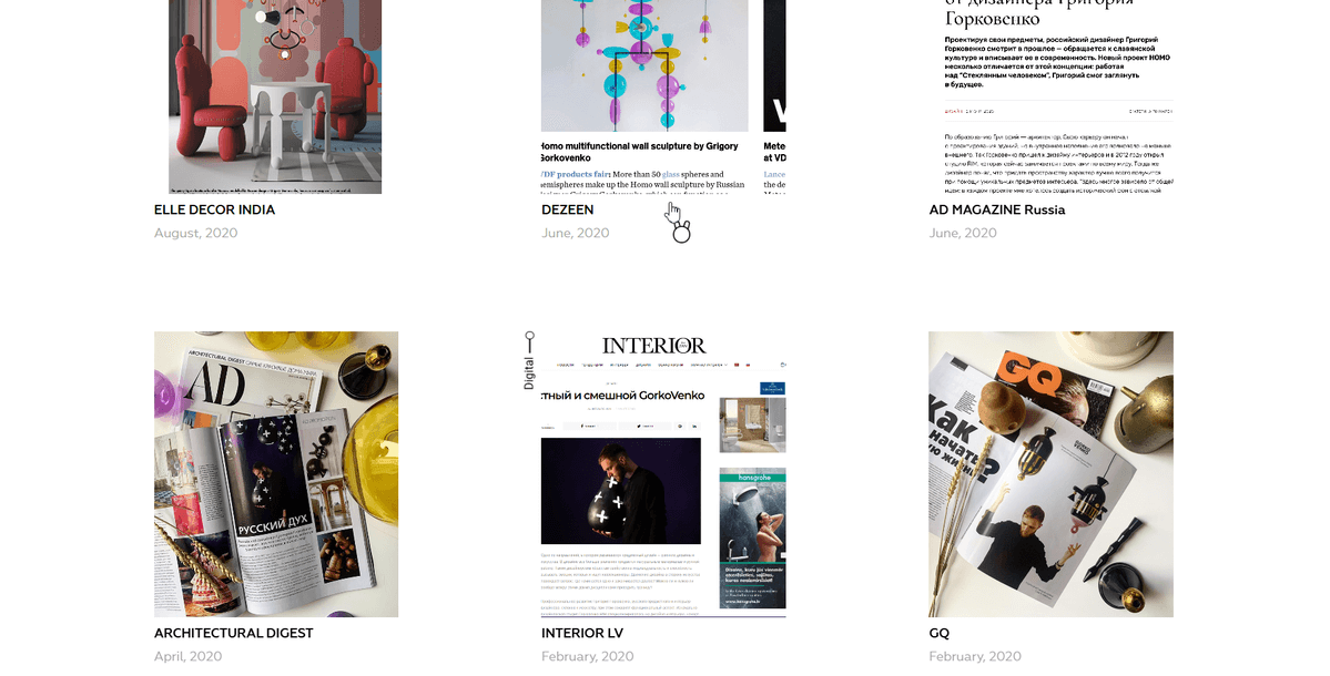 This is an important part of the client’s business — publications represent recognition, and this recognition comes from various major magazines. The content for this section is simple and straightforward: covers and spreads from print editions, as well as links to articles in digital versions.