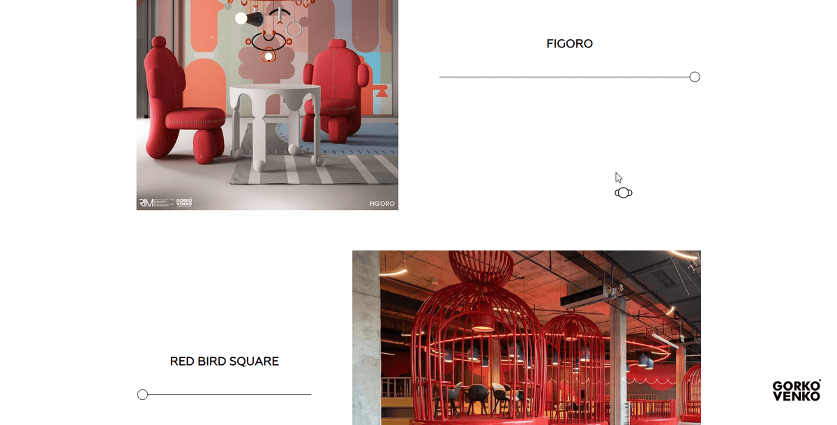 On the Interiors page specifically, the cursor guides users by showing that the carousel of the designer’s projects can be controlled simply by hovering. Depending on how far you move the cursor to the side, not only does its design and animation change, but also the scrolling speed. We implemented this feature so that both laptop users with touchpads and desktop users with mice can experience the site’s design differently, creating their own personalized interaction experience.