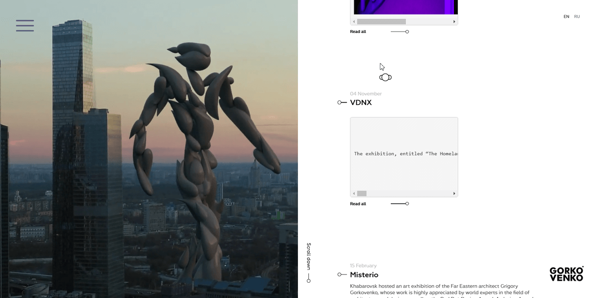 In the “Interiors” section, you’ll find a smooth carousel with subtle innovative details that appear when you hover over items. By the way, the cursor itself deserves special mention — throughout the site, it takes on different shapes, each one our interpretation of the distinctive design forms found in Grigory’s work, created under his close guidance. This way, we constantly reference his artistry, infusing the site with the owner’s ideas and creativity.